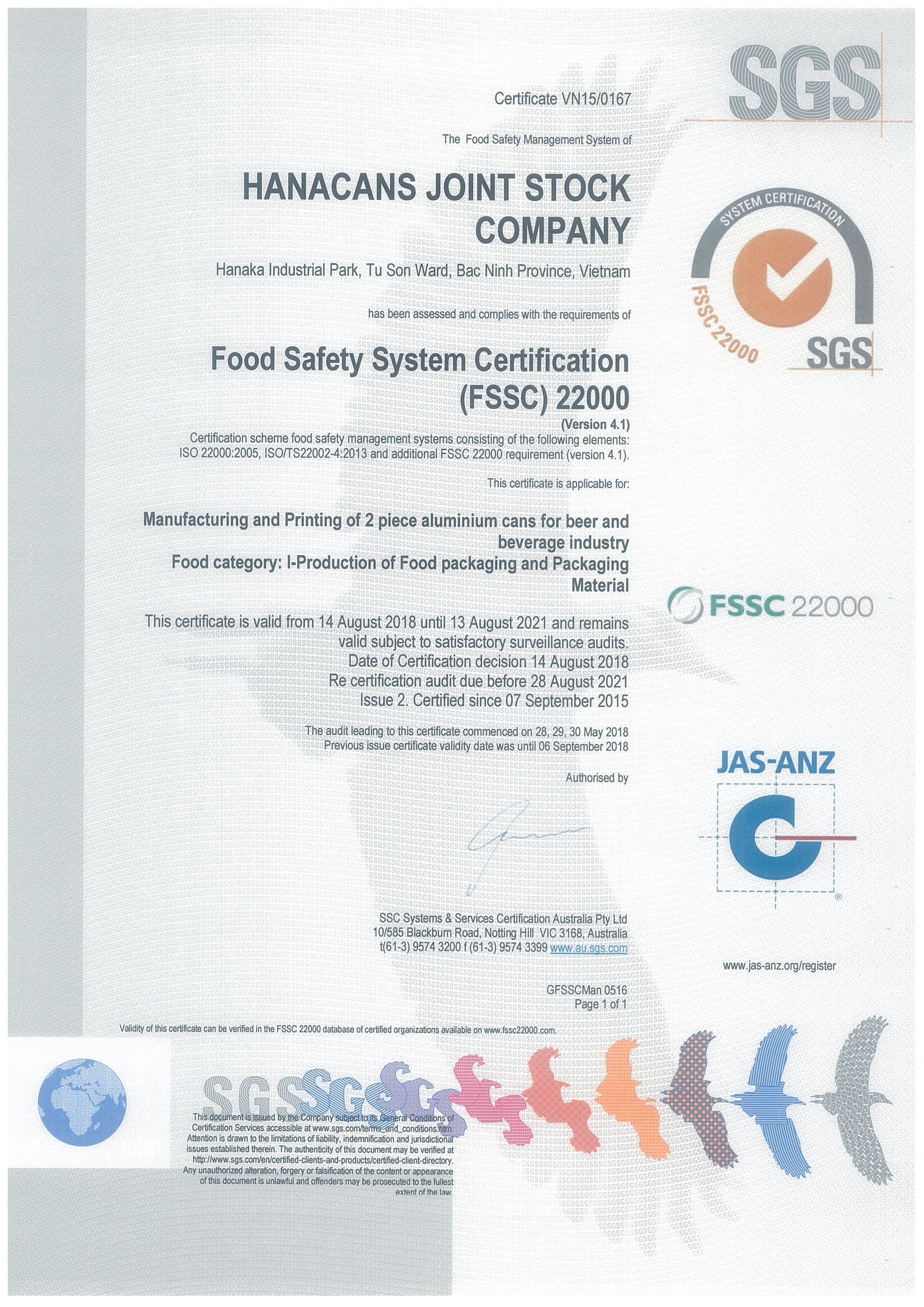 Hanacans đạt được Chứng chỉ Hệ thống An toàn Thực phẩm vào ngày 14 tháng 8 năm 2018 tại nhà máy Bắc Ninh.
