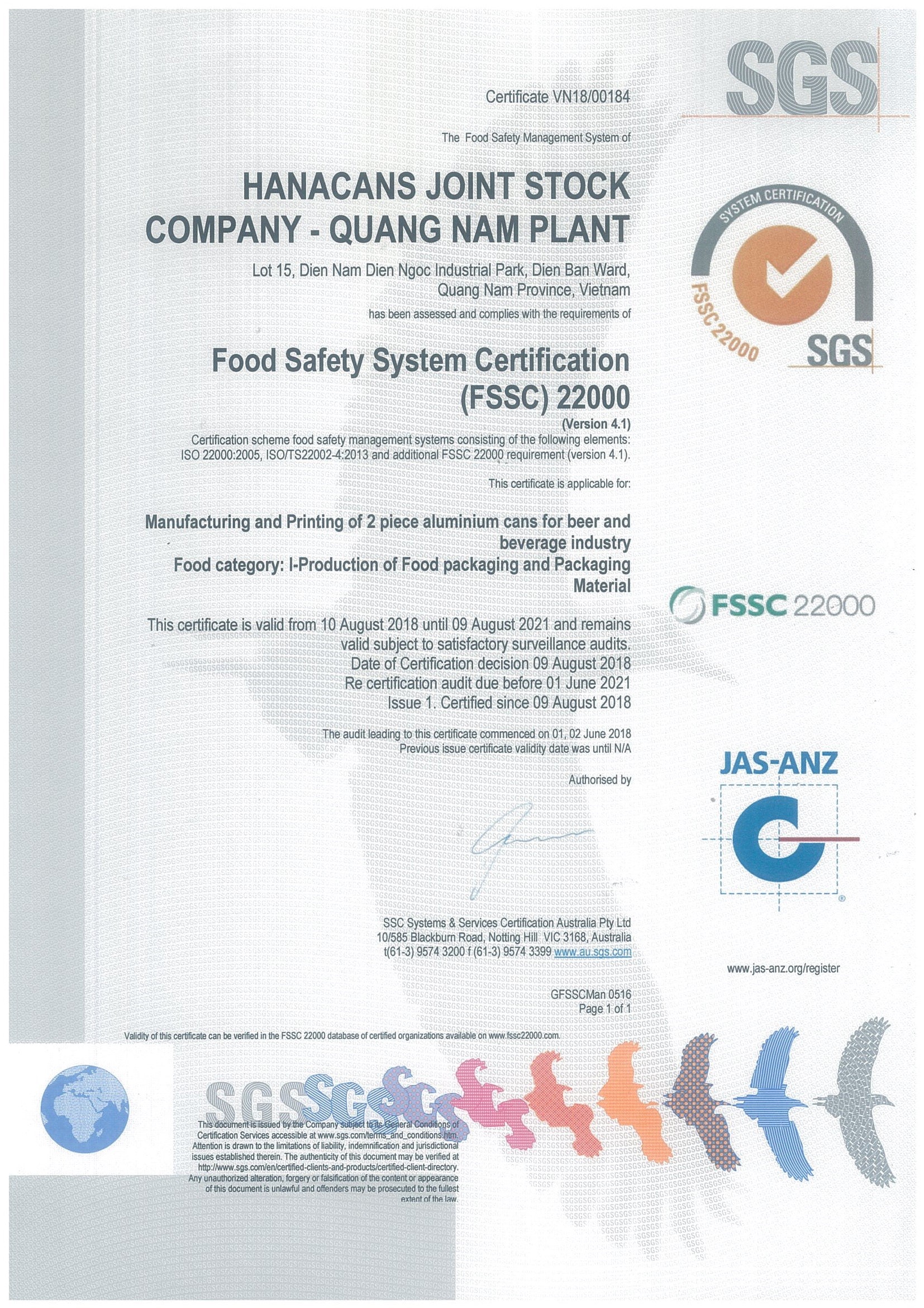 Hanacans đạt được Chứng chỉ Hệ thống An toàn Thực phẩm vào ngày 10 tháng 8 năm 2018 tại nhà máy Quảng Nam.