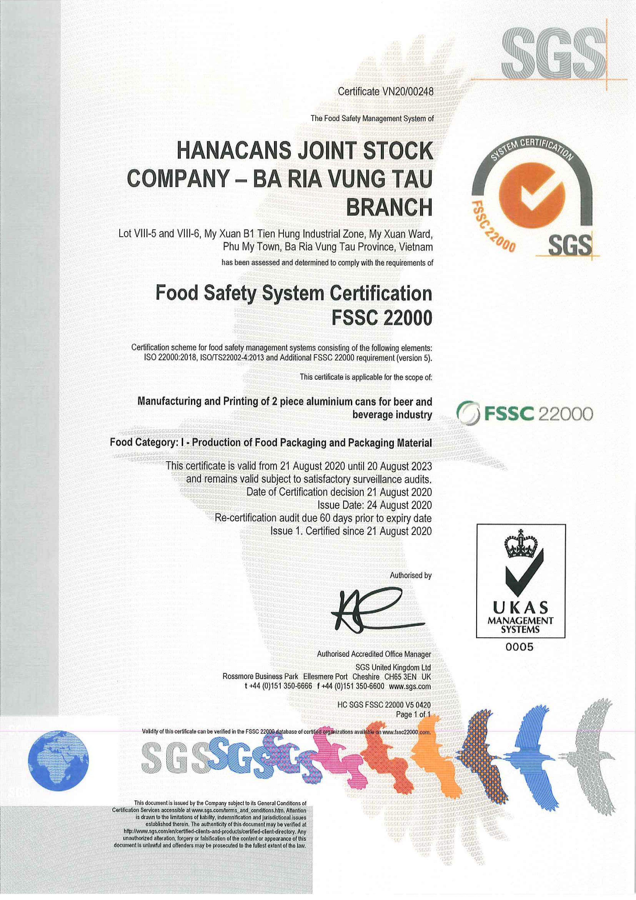 Hanacans đạt được Chứng chỉ Hệ thống An toàn Thực phẩm vào ngày 21 tháng 8 năm 2020 tại nhà máy Vũng Tàu.